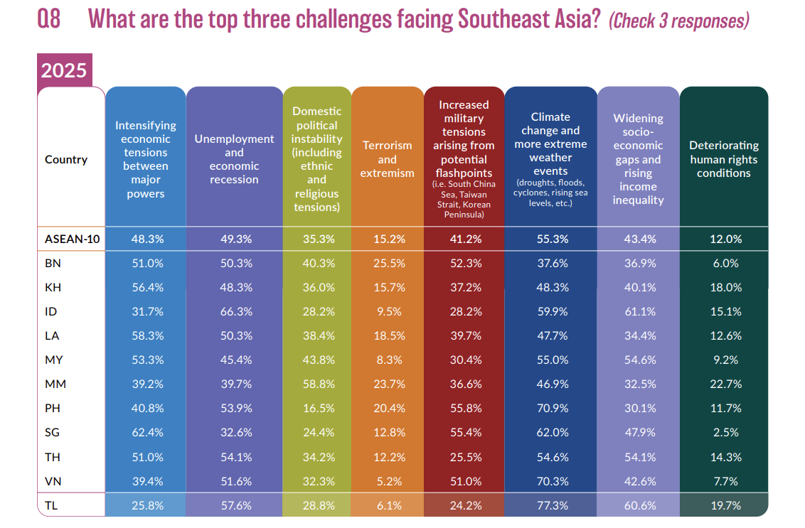 2024年にトップだった「失業と景気後退の懸念」も依然として重要課題として認識する人が二番目に多く(49.3%)、次いで「主要国間の経済的緊張の激化への懸念」(48.3%)が三位となった。ただし、この2つの項目の差はわずか1.0%であり、同リポートでは「東南アジアにとっては『失業と景気後退』と『主要国間の経済緊張』が表裏一体の課題となっている」との見解を示している。