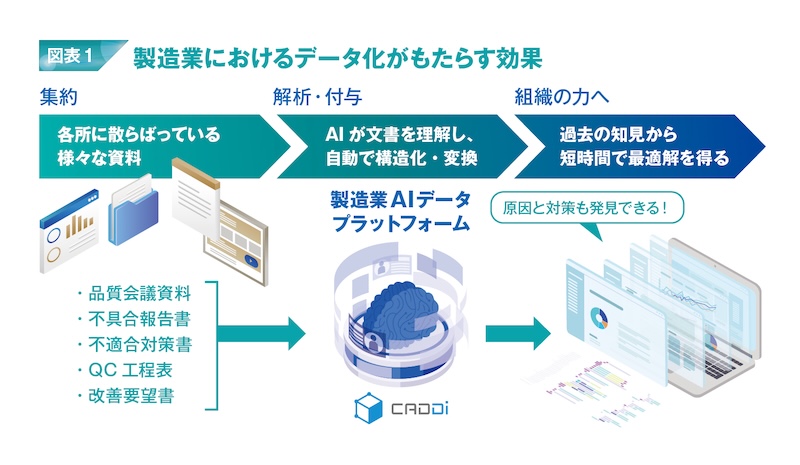 最後の講演には、キャディの河野翔氏が登壇。製造現場に共通する課題として「経験とデータの間にあるギャップ」を挙げ、「現場には長年の知恵が蓄積されているが、データ化されず次に生かされにくい。その結果、同じ課題に何度も直面している」と指摘した。解決の鍵となるのが、AIが理解しやすい形式に情報を整理する“AIフレンドリーなデータ”の仕組みだ。図面や報告書を自動的に構造化し、知見を共有できるようにすることで、トラブル時には過去の事例を参照し、設計段階では後工程の制約を事前に把握できるようになる(図表1)。