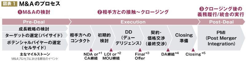 図表1の通り、M&Aを進めていくには大きく3つのプロセスがある。すなわち、①Pre-Deal (M&Aの検討)、②Execution (相手方との接触〜クロージング)、③Post-Deal (クロージング後の義務履行、統合の実行)である。
