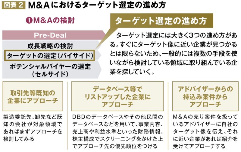 ①Pre-Dealにおいては後ほども触れていくが、特に買収する側の視点に立つと、何を買収したいのかを改めて整理し (成長戦略の検討)、ターゲットを選定するという流れになる。