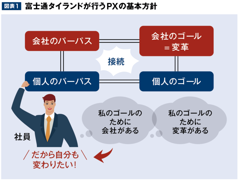 仕事を単なる生計維持の手段ではなく、自分の人生の目的を実現するプロセスとして捉えられれば、組織への帰属意識も変わってくる。変化が激しい時代背景・労働環境で、まずこの「個人との接続」を設計したことが、富士通タイランドにおけるPXの出発点であり、独自性だと言える。