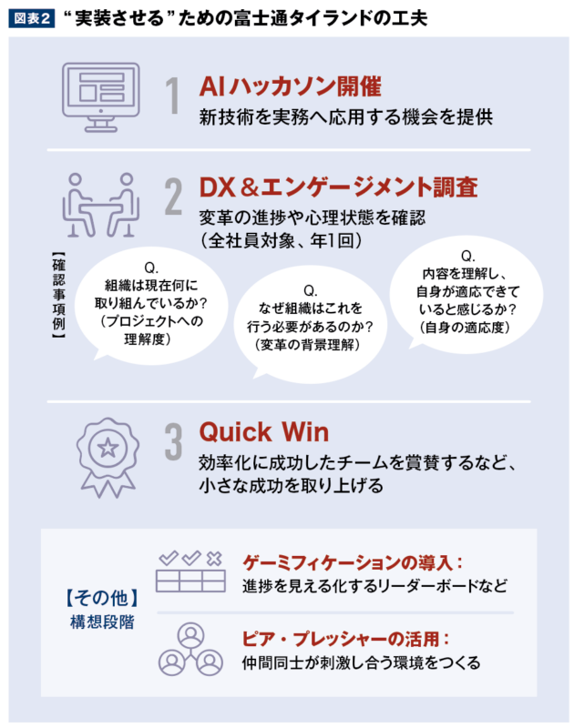 加えてプラパン氏は、進捗を見える化するリーダーボードなどのゲーミフィケーション、仲間同士が刺激し合うピア・プレッシャーの活用など、変化を義務ではなく前向きな挑戦として捉えられる工夫を提案している(図表2)。