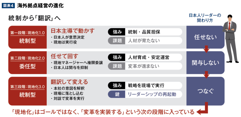 筆者が「現地化3.0」と呼ぶ第三段階は、統制への先祖返りではない。タイ人が経営を担う方向性は変わらない。しかしその過程において、日本人リーダーのあり方は「統制する」でも「口を出さない」のいずれでもなく、その間の「翻訳する人」というあり方だ(図表4)。