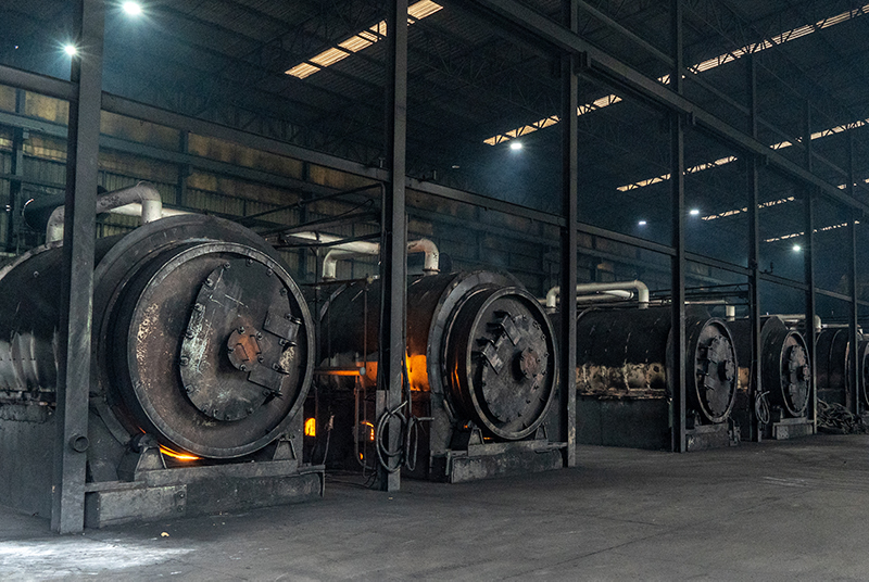 廃タイヤの熱分解リサイクルでは、まず集荷した廃タイヤのサイドウォールを切断し、熱分解炉で380〜650度で約8時間加熱する。同社の熱分解炉では1基あたり10トンのタイヤを処理可能だ。
