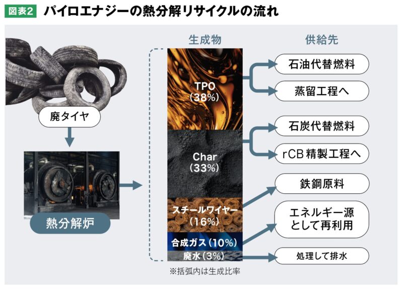 一方、Charを精製して不純物を取り除いた再生カーボンブラック(rCB)は、タイヤ原料としての利用が見込まれる。「タイヤは天然ゴムと合成ゴム、カーボンブラック、その他原料で構成されているが、その中でカーボンブラックと合成ゴムが全体の約60%を占め、タイヤ製造において不可欠な補強材である。