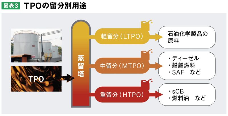 TPOは代替燃料としてすでに広く流通しているが、さらに蒸留・精製工程を経ることで、軽留分(LTPO)、中留分(MTPO)、重留分(HTPO)に分けられる(図表3)。