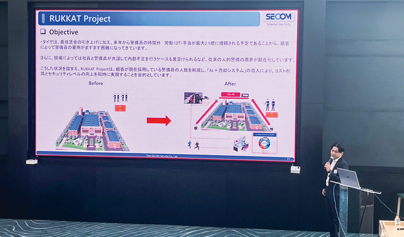 私がタイに赴任して以来、「ハイブリッド警備」を積極的に提案し、売上面でも成果を上げてきました。こうした実績を踏まえ、現在はタイセコム全体としてハイブリッド型の提案に注力する方針を決定し、今年1年間で250件、4,860万バーツの契約を目標に掲げています。