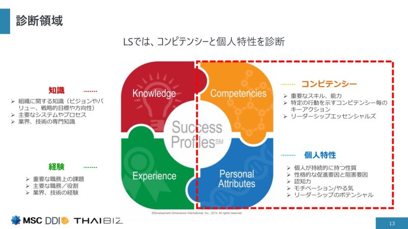 同氏は続けて、「“成果創出型リーダー”に求められる要件は、各社の事業戦略によって異なる。そのため、まずは事業戦略を起点に、ビジネスを推進するドライバーを特定し、それに基づいた人材プロフィールを描くことが重要である」と指摘。「人材プロフィールを構成する要素のうち、“知識”と“経験”は社内に蓄積されたデータを活用できるケースが多いが、“コンピテンシー”と“個人特性”については、LSのようなアセスメントツールの活用が有効である」と解説しました。