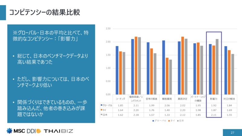続いて同氏からは、グローバルおよび日本の平均値との比較結果についての解説がありました。コンピテンシーに関しては、総じて日本のベンチマークデータを上回る結果となりました。ただし、特徴的な点として、「影響力」のスコアが日本の平均値を下回っていることが挙げられます。