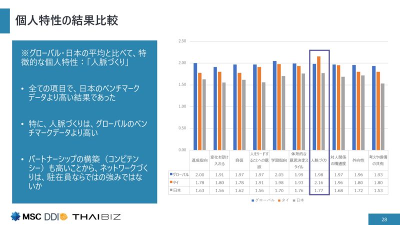 一方、個人特性については全項目で日本のベンチマークを上回る結果となり、特に「人脈づくり」はグローバル平均をも上回る高いスコアを示しました。また、コンピテンシーにおける「パートナーシップの構築」も高いことから、同氏は「ネットワークづくりは、タイ駐在員ならではの強みだろう」と考えを述べました。