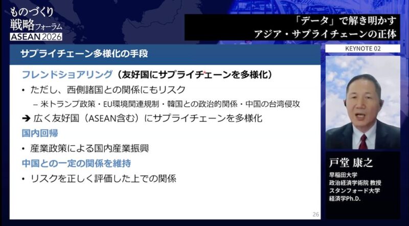 戸堂氏は、地政学リスク・保護主義が高まる時代に日本企業が取るべき具体的な行動として、「サプライチェーンを多様化すること」が鍵だと指摘。特にASEANの国々にサプライチェーンを多様化することが重要だと説く。