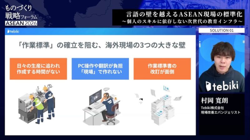 ASEANの製造現場で誰もが直面する「マニュアルが形骸化する」問題。Tebikiの現場改善エバンジェリスト村岡寛朗氏は、海外現場では「時間的な制約」「PC操作・翻訳の負担」「マニュアル改訂の面倒さ」という作業標準の確立を阻む3つの壁があると指摘する。