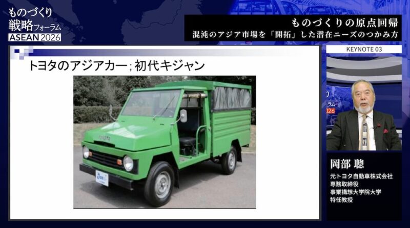 最後のセッションに登壇したのは、「世界でトヨタを売ってきた男」 — 元トヨタ自動車株式会社専務取締役の岡部聰氏。同氏は、新興国市場での成功の核心を「データではなく現場で掴んだ潜在ニーズ」にあると語る。