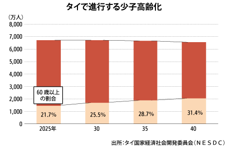 タイの総人口に占める60歳以上の割合は現在2割を超えている。総人口が減少していく中、高齢者の割合は相対的に高まり、15年後には3割超に達すると推計されている。