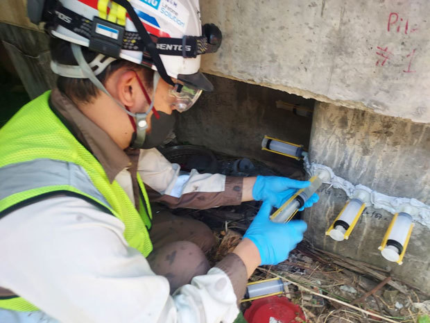 技術者が「低圧注入工法」で橋脚を補修する様子(CPAC SB&M提供)