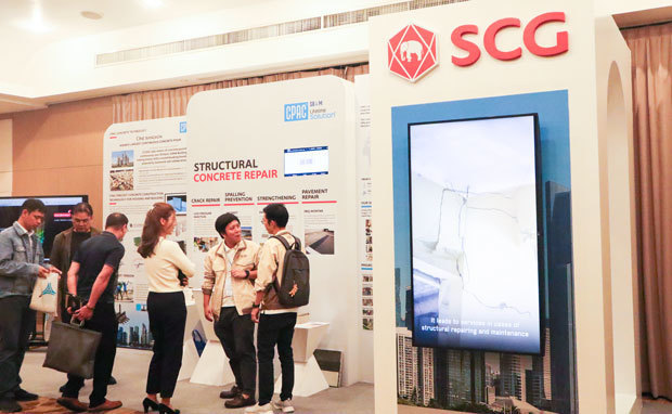 CPAC SB&Mは、タイの研究機関などと協力し、地震の影響や被害防止に関するセミナーを開催している(写真はセミナー会場に設置された同社のブース)=9月、首都バンコク(NNA撮影)