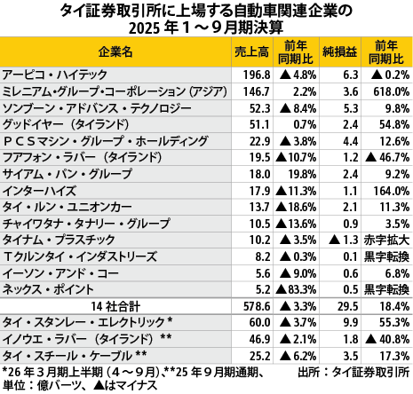 SETに上場する自動車関連企業14社の25年1~9月期決算は、増収が3社にとどまった一方、増益(黒字化含む)は11社だった。