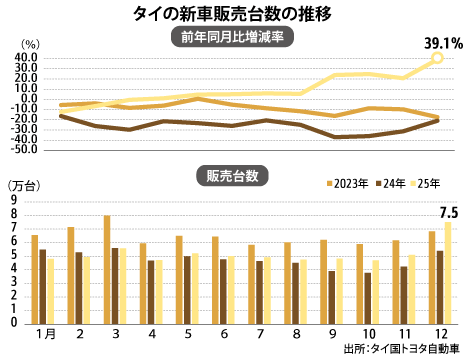 25年12月の新車販売数は、前年同月比39.1%増の7万5,121台に伸長した。9カ月連続でプラスとなった。EV3.0の期限が迫ったことや、11月下旬から12月上旬にかけて開催された自動車展示・販売会「第42回タイ国際モーターエキスポ2025」が追い風となり、大幅に伸びた。