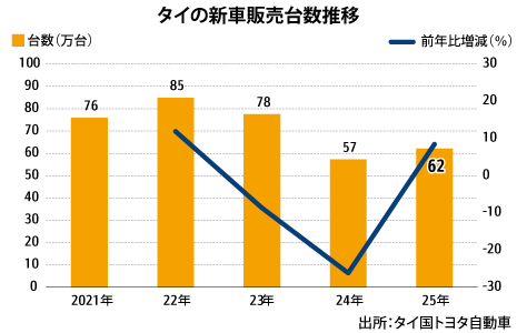 トヨタ自動車のタイ法人、タイ国トヨタ自動車(TMT)が1月30日に発表した2025年のタイの新車販売台数は前年比8.5%増の62万1,166台だった。前年の26.2%減から持ち直し、3年ぶりに増加へ転じた。政府の電気自動車(EV)支援策により、中国系ブランドが大幅なプラスとなり、全体を押し上げた。その結果、日系ブランドのシェアは69.3%と7割を下回った。TMTは、26年の新車市場が1.4%増の63万台となり、緩やかに回復していくと予想した。