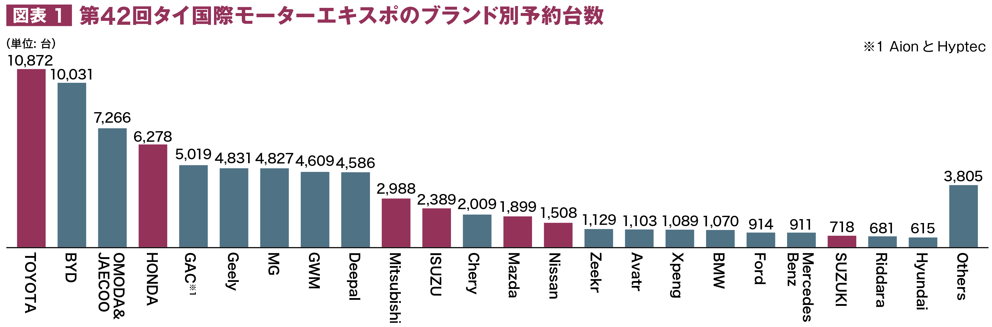日本勢は10位以内にトヨタ、ホンダ、三菱の3社が残り、昨年8位だった日産は14位まで後退した(図表1)。日本勢で最も伸びたのは首位を守ったトヨタであり、フルモデルチェンジしたピックアップのHilux Travoや、今年8月に新規投入したYaris ATIVのHEV版等により前年比3割増となった。一方、中国系は7社が10位以内に入り一段とプレゼンスを高めた。BYDは昨年比4割増で2位を維持したほか、OMODA&JAECOOが昨年比6倍増、Geelyも同7倍増と大きく伸ばし、いずれも初めて10位以内に入った。