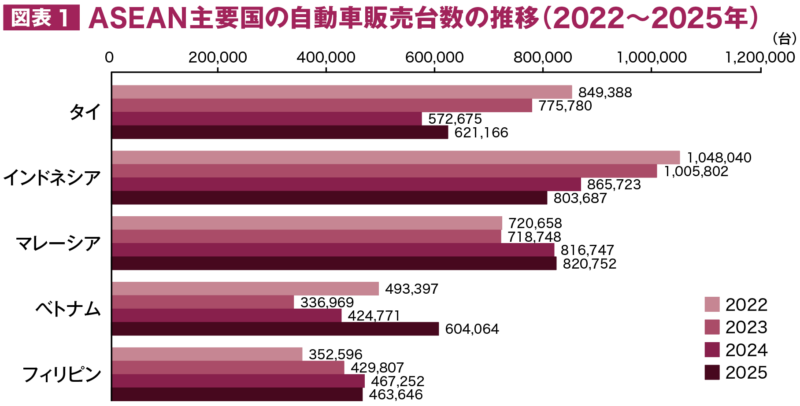 マレーシアが首位に立ち、ベトナムがタイに急追するなど、2025年のASEAN自動車市場には大きな変化がみられた。また、電気自動車(EV)の普及が各国で加速しており、これが日系のシェア低下と中国系および地場系のシェア上昇につながっている。本稿では、タイ、インドネシア、マレーシア、ベトナムの4ヵ国を中心に、ASEAN市場の動向を分析する。