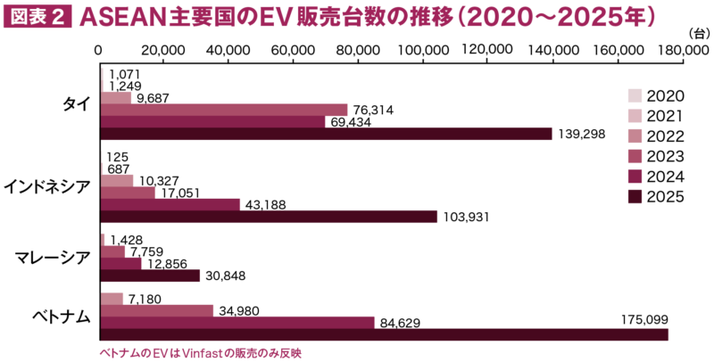 ベトナムを除きいずれも国内市場は伸び悩んでいるが、EV販売は急増している(図表2)。