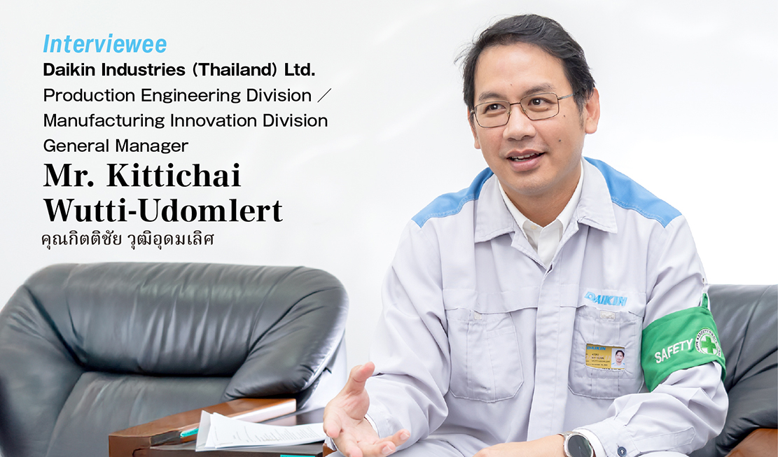 ในช่วงไม่กี่ปีที่ผ่านมา บริษัทสัญชาติญี่ปุ่นที่ดำเนินงานในประเทศไทยมีแนวโน้มปรับกระบวนการให้เป็นการดำเนินงานแบบท้องถิ่น (Localization) มากยิ่งขึ้น ท่ามกลางกระแสนี้ บริษัท ไดกิ้น อินดัสทรีส์ (ประเทศไทย) จำกัด (เรียกโดยย่อว่า DIT) ซึ่งเป็นบริษัทย่อยของกลุ่มบริษัทเครือไดกิ้น (Daikin Group) ผู้ผลิตเครื่องปรับอากาศ เครื่องทำความเย็นและทำความร้อนที่ได้รับการยอมรับในฐานะผู้นำอันดับ 1 ของโลก* กำลังก้าวเข้าสู่ความท้าทายที่เรียกว่า ‘พลิกโฉมการดำเนินงานแบบท้องถิ่น (Beyond Localization)’ บุคลากรและเทคโนโลยีของบริษัทซึ่งได้รับการพัฒนาในประเทศไทยนี้ ไม่เพียงแต่สร้างประโยชน์ในประเทศเท่านั้น แต่กำลังขยายขีดความสามารถไปสู่ระดับโลก และกำลังกลายเป็นพลังขับเคลื่อนสำคัญในการเสริมสร้างความแข็งแกร่งให้กับกลุ่มบริษัทไดกิ้นโดยรวม
