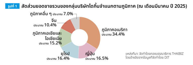 ณ เดือนมีนาคม ปี 2025 กลุ่มบริษัทไดกิ้นทั่วโลก (Global Consolidated Net Sales) ได้สร้างสถิติยอดขายสุทธิรวมสูงสุดเป็นประวัติการณ์ที่ 4.7523 ล้านล้านเยน ซึ่งหมายความว่ายอดขายได้เติบโตขึ้นประมาณ 6.5 เท่า ภายในระยะเวลา 20 ปี และสิ่งที่น่าจับตาเป็นพิเศษคือ สัดส่วนของยอดขายในต่างประเทศที่เพิ่มสูงขึ้นอย่างมาก คุณคุริฮาระ ประธานบริษัท ได้อธิบายว่า ในปี 2003 “สัดส่วนยอดขายในต่างประเทศ เคยอยู่ที่ 37% แต่ปัจจุบันได้เพิ่มขึ้นเป็นประมาณ 83% ของส่วนแบ่งยอดขายตามภูมิภาค (ดังที่แสดงในรูปที่ 1) อันดับสูงสุดคือ ภูมิภาคอเมริกา ประมาณ 34.4% ตามมาด้วย ญี่ปุ่น (ประมาณ 16.5%) ยุโรป (ประมาณ 16.4%) และภูมิภาคเอเชียและโอเชียเนีย (ประมาณ 15.2%)”