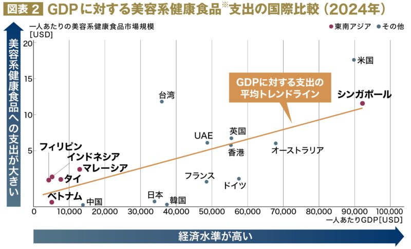 欧米ではサプリメントが体調管理や予防医療の一環として位置づけられるが、東南アジアでは「健康」と「美」が強く結びつき、若さや美肌、スリム体型など外見的効果への期待が購買の主要動機となっている(図表2)。