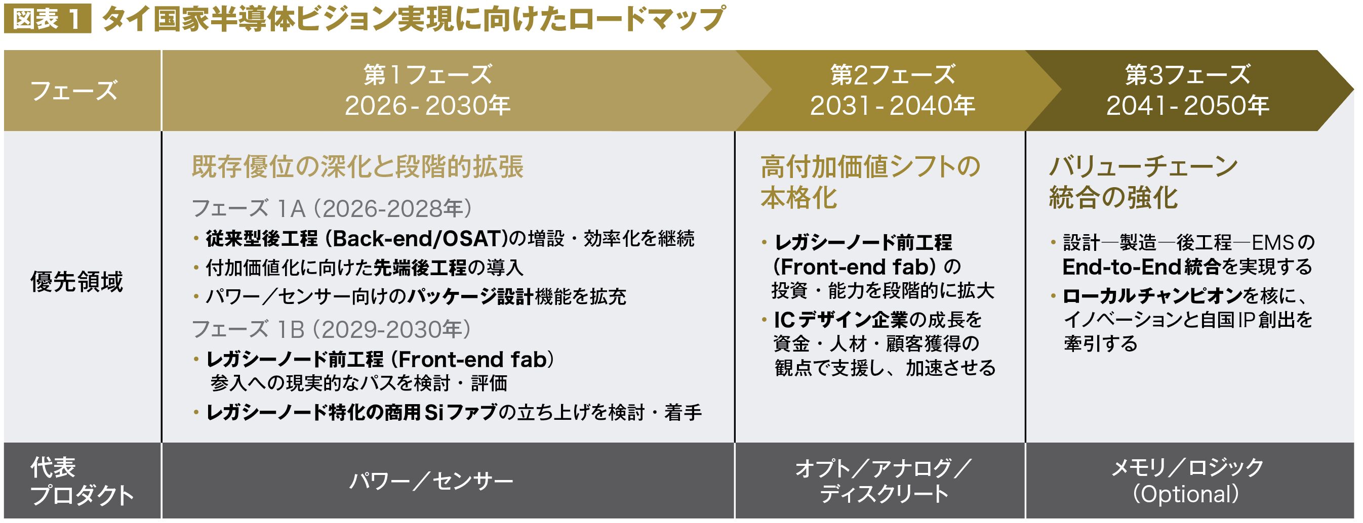第2フェーズ(2031–2040年):レガシーノード前工程(Front-end fab)とICデザインを段階的に拡張し、高付加価値シフトを本格化する。