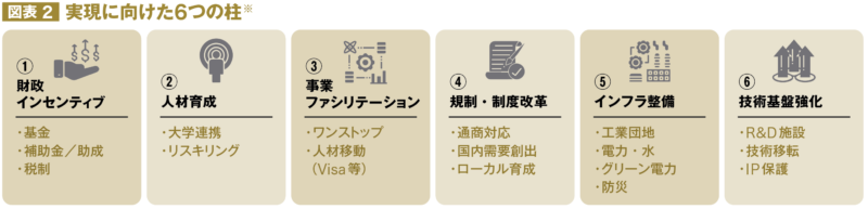 税制の優遇だけでは投資は動かない。資金、人材、制度、インフラ、技術基盤までを一体で整え、投資判断の不確実性と摩擦を下げる、という発想である。柱立ては以下の通りである。