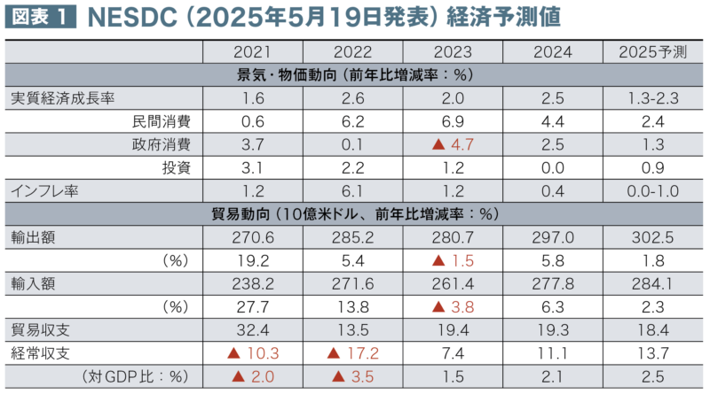 タイ国家経済社会開発委員会(NESDC)の5月19日の発表(図表1)によると、2025年第1四半期の経済成長率は前年同期比+3.1%だった。業種別に見ると、農業は同+5.7%と前期の同+1.1%から大きく加速し、製造業も同+0.6%と前期の同+0.3%からやや加速した。一方、サービス業は観光需要が伸び悩み同+4.2%と前期の同+4.7%から減速した。また、同委員会の2025年通年の成長率見通しは、米国の相互関税や家計債務の高止まりの影響で、同+1.3〜2.3%と前回予想から下方修正された。