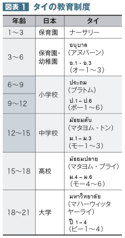 さて、こうした背景を持つタイの教育制度はどうなっているのだろうか。基本的な教育制度は日本と同様の6年(小)─3年(中)─3年(高)─4年(大)制で、中学までが義務教育だ。2学期制で1学期が5月中旬〜8月下旬、2学期が11月上旬〜4月下旬。学期の間は休みとなる。新学期が始まると、高架鉄道(BTS)が急に混み始めたと感じることになる。学年の呼び方は独特だ。小学生は「ポー1〜6」、中高生は「モー1〜6」、大学生「ピー1〜4」と呼ぶ。中学と高校をまとめて中等教育と捉えているため、高校3年生は「モー6」となる(図表1)。