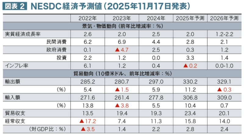 農業は同+1.9%、非農業は同+1.2%で、第2四半期のそれぞれ+6.4%、+2.5%から減速しており、製造業は同▲1.6%とマイナスに転じた。一方、卸・小売業および修理業は同+6.5%と、第2四半期の+6.3%から引き続き堅調だった。2025年1〜9月の経済成長率は同+2.4%となった。また、2025年通年の成長率見通しは+2.0%、2026年通年の成長率見通しは+1.2〜2.2%とされた。