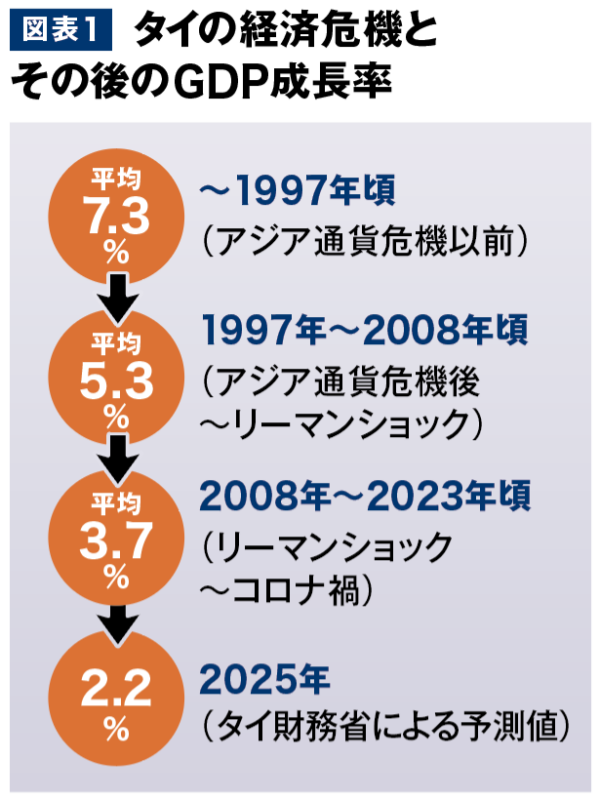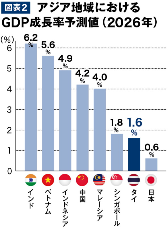 実際、タイの国内総生産(GDP)は長期にわたり低下している。かつて7%だった成長率は、近年では2%前後にとどまっており、アジア周辺国・ASEAN内でも差は広がっている(図表1・2)。
