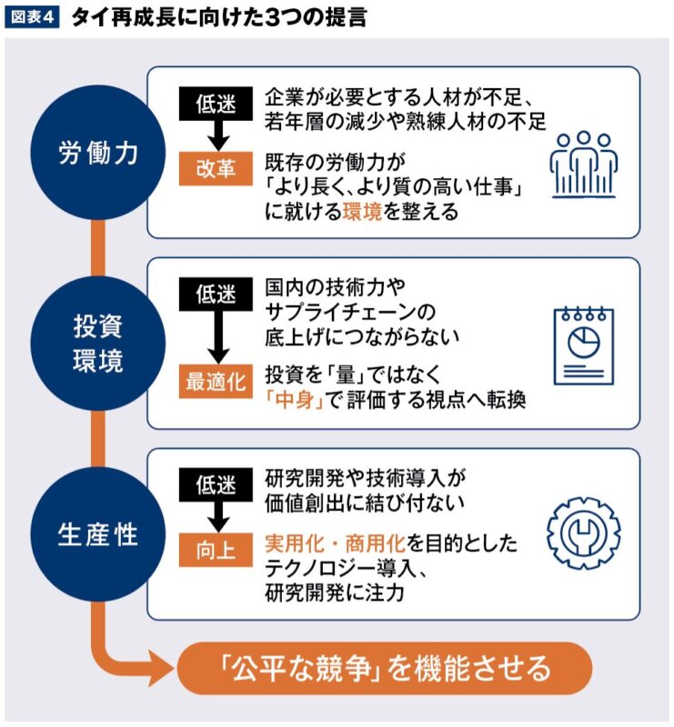 価格競争に依存しない成長へと舵を切るためには、何が必要なのか。同所長はまず、製造業の「低迷」を打開する策として、タイ政府へ次の3点を提言する(図表4)。