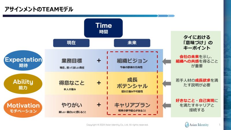 次に、講師の山内氏が「タイ人への業務アサインメント」について解説しました。同氏は「特にタイでは、若者のキャリアのスピード感が早巻きになっていることや、自分らしいキャリアを求める傾向、日系企業の将来像の不透明さなどから、“仕事の意味づけ”が必要な時代へと突入しているため、アサインメントの重要性が増している」とした上で、「業務目標、本人の得意分野、やりがいといった現在の要素だけでなく、組織ビジョン、本人の成長ポテンシャルやキャリアプランなど未来を見据えたアサインメントが求められている」と訴えました。