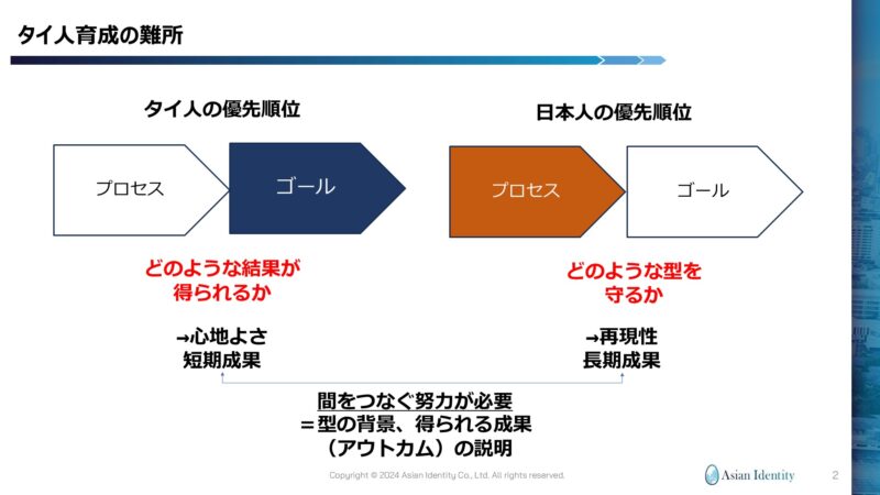 最後に中村氏から、タイ人育成のポイントについて解説がありました。さらに、タイ人育成の難所として「結果を重視するタイ人と、型を守ることを重視する日本人」という価値観の違いを取り上げ、「型の裏にある背景や得られる成果(アウトカム)を説明することで、すれ違いを防ぐことが可能だ」と見解を述べました。