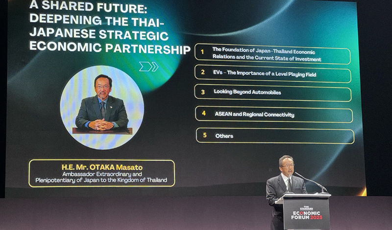 基調講演に登壇した在タイ日本国大使館の大鷹正人大使は、日タイの経済関係と今後の投資の方向性について、「日本は2022年までタイへの投資額で首位を維持していたが、その後は中国とシンガポールに追い抜かれた。しかし、日本からタイへの投資は安定性が高く、累計投資額は約40兆バーツで依然としてタイへの最大投資国だ」とし、「日本企業は、自動車・部品産業、化学・電子産業、AI技術、環境・バイオマスエネルギー、先端医療技術、宇宙探査、食品産業など、多岐にわたる分野に大きな可能性を見出している」と明かした。