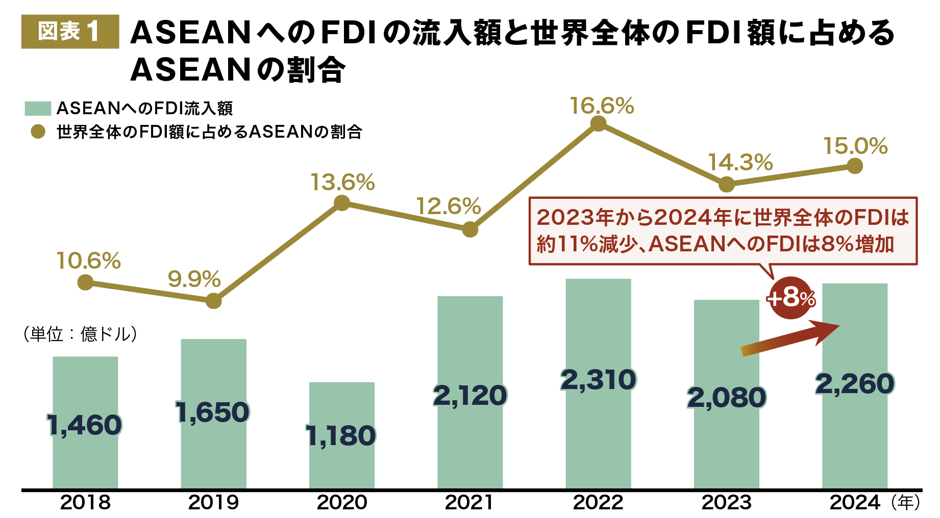 「新たな地政学的時代に向けたタイの投資誘致戦略」に関する講演に登壇したタイ投資委員会(BOI)のナリット長官は、ASEAN全体の投資トレンドについて「世界全体の海外直接投資(FDI)は2024 年に11%減少したにも関わらず、ASEANへの投資は8%増加している(図表1)。