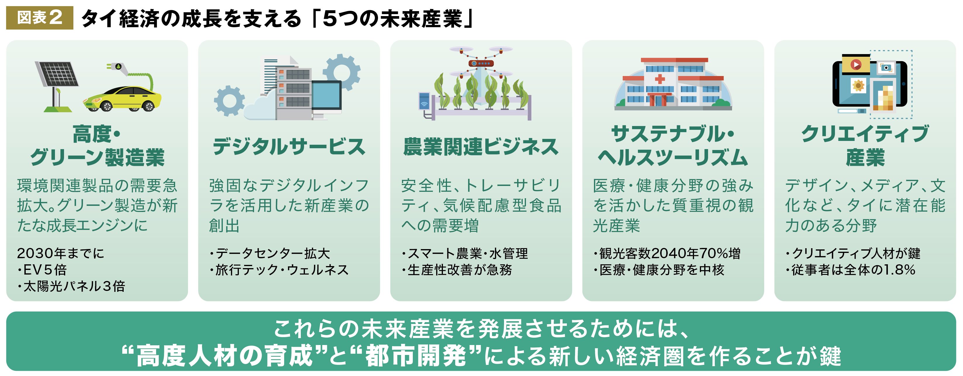 こうした構造的な課題により、タイのGDP成長率は依然として5%を下回っている。タイが高所得国へ移行するためには、方向性を明確にし、世界的なメガトレンドに直結する高成長産業に重点投資する必要がある。世界銀行のタイ・ミャンマー担当メリンダ・グッド局長は、今後のタイ経済の成長を支える「5つの未来産業」を示した(図表2)。