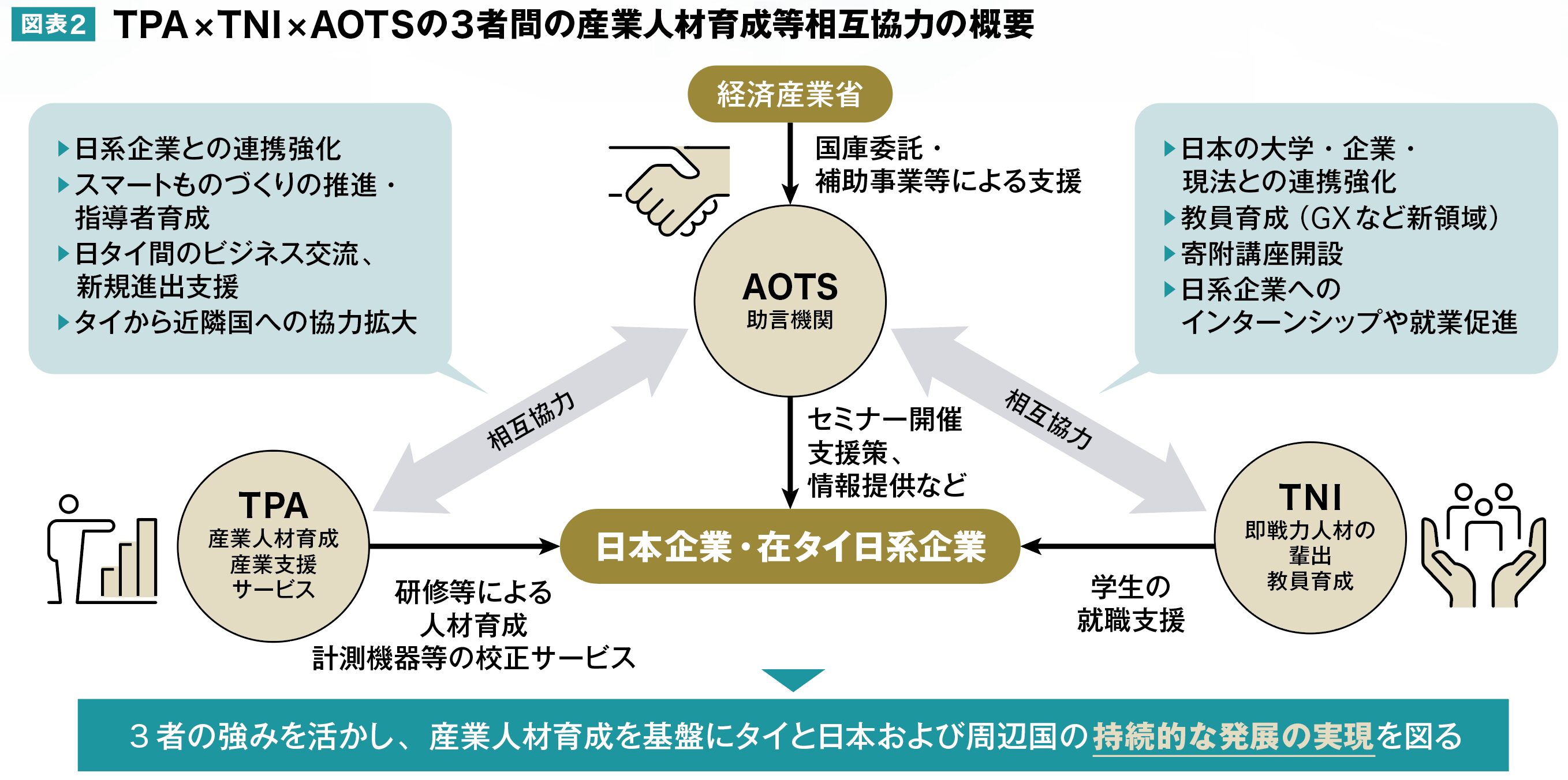 TNIは教員育成や学生のインターンシップ、就職機会の提供を、AOTSはグローバルネットワークや専門知識を、TPAは現地での展開を担い、産業の持続的な発展に貢献していきます(図表2)。