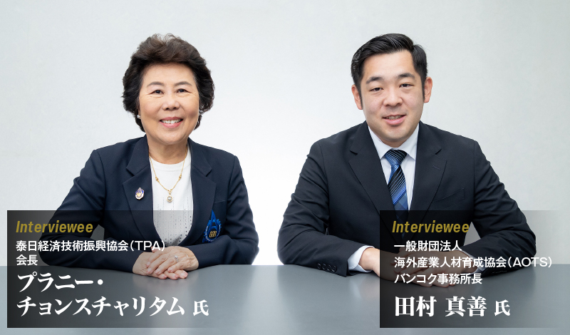 日本で学んだ元留学生や研修生たちが中心となって1973年に設立されたTPA。以来50年以上にわたる活動の背景には、「常に日本側パートナーであるJTECS、そしてAOTSの協力があった」とTPAのプラニー会長は語る。ここでは、プラニー会長と日本側パートナーであるAOTSの田村真善バンコク事務所長に、両者の協力の歩みと今後の展望を聞いた。