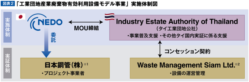廃棄物モデル事業は、NEDOとタイ工業団地公社(IEAT)との間で締結されたMOUのもと、日本鋼管株式会社(現・JFEホールディングス)をプロジェクトの主幹実施者として推進された(図表2)。