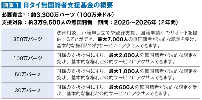 同基金では約3,300万バーツ(100万米ドル)の資金調達を目標としており、集まった支援金は無国籍者が国籍や永住権を取得するための法的手続き支援に充てられます(図表1)。