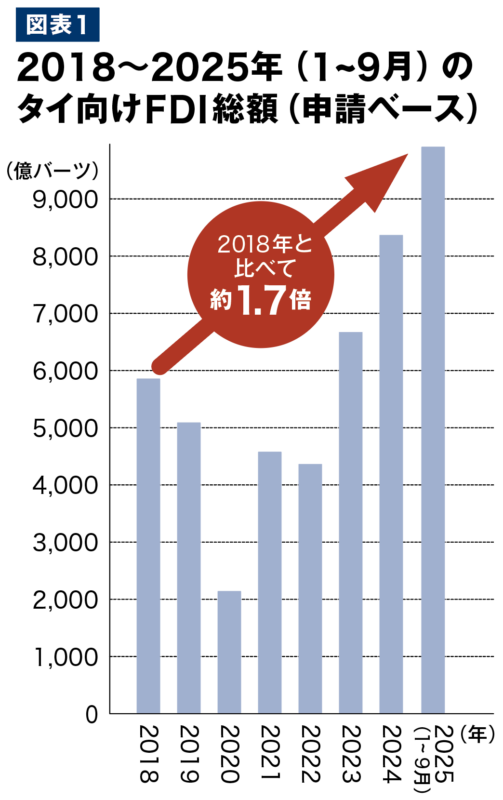 ジャリーポーンCEOは「2025年(1〜9月)のFDI総額(申請ベース)は、タイ投資委員会(BOI)設立以来の最高額となる約9,800億バーツを突破。米中貿易戦争の第1ラウンドが始まった2018年と比べて約1.7倍に達した(図表1)。この大幅な増加は、投資家のタイ経済への高い信頼感を示している」と説明する。