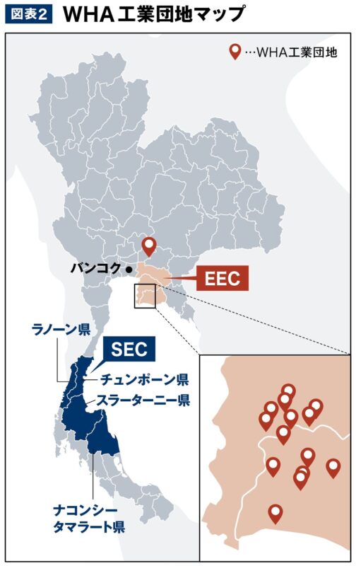 ジャリーポーンCEOは「WHAグループがタイで運営する15の工業団地のうち、14団地がEECに位置する(図表2)。これは、同地域が東南アジアを代表する製造拠点としての実力と基盤を備えていることを示す」と、EECのプレゼンスの高さを強調する。